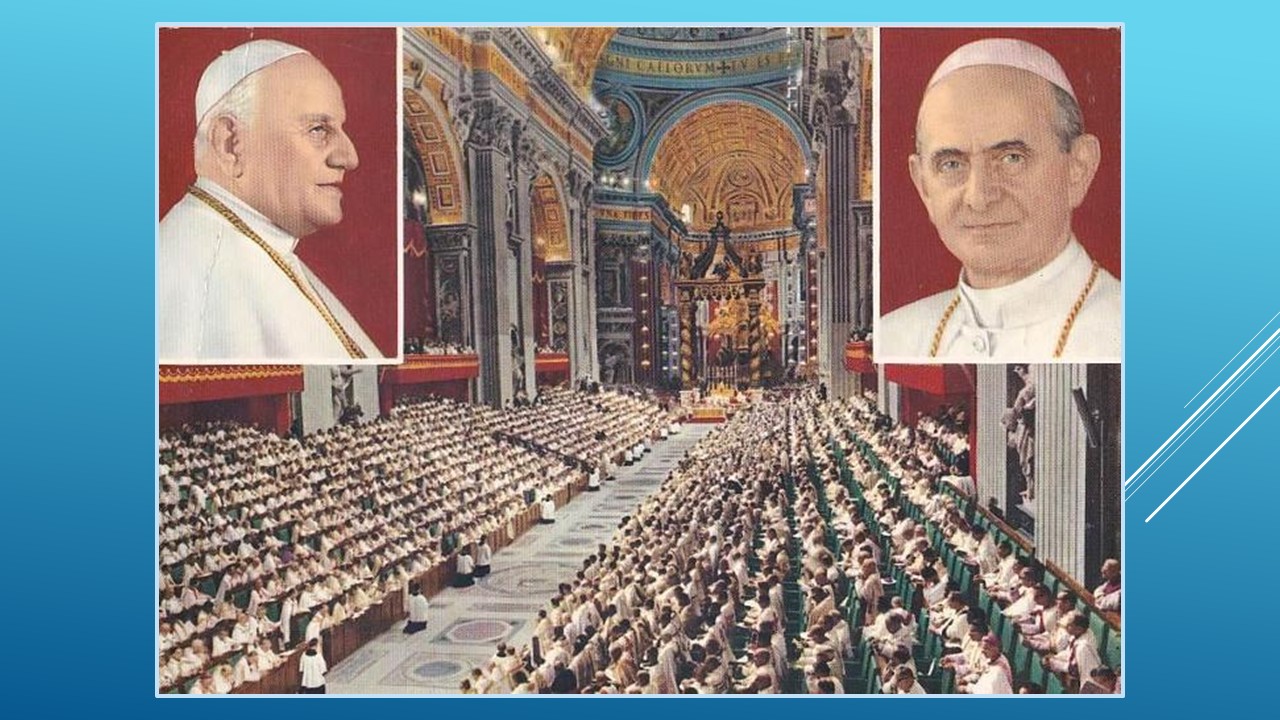 Ale to není jediná změna, kterou koncil přinesl. Zásadnější je změna v pojetí církve. dřív se chápala církev jako pyramida, na jejímž vrcholu stojí papež, vedený samotným Kristem, a od něj směřuje autorita dolů, přes biskupy a kněze až k řadovým věřícím. Koncil ale říká, že všechny věřící vede Duch svatý, proto církev není pyramida, ale společenství, dnes bychom řekli síť, ve které jsou si všichni rovni, mají stejnou důstojnost, liší se jen v úkolech a v míře odpovědnosti.