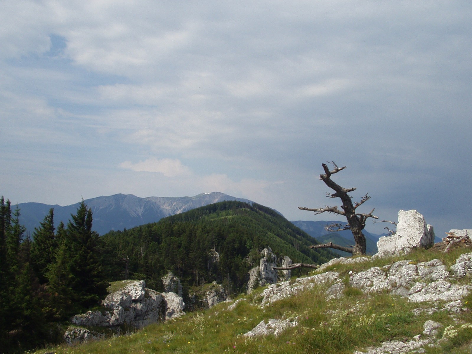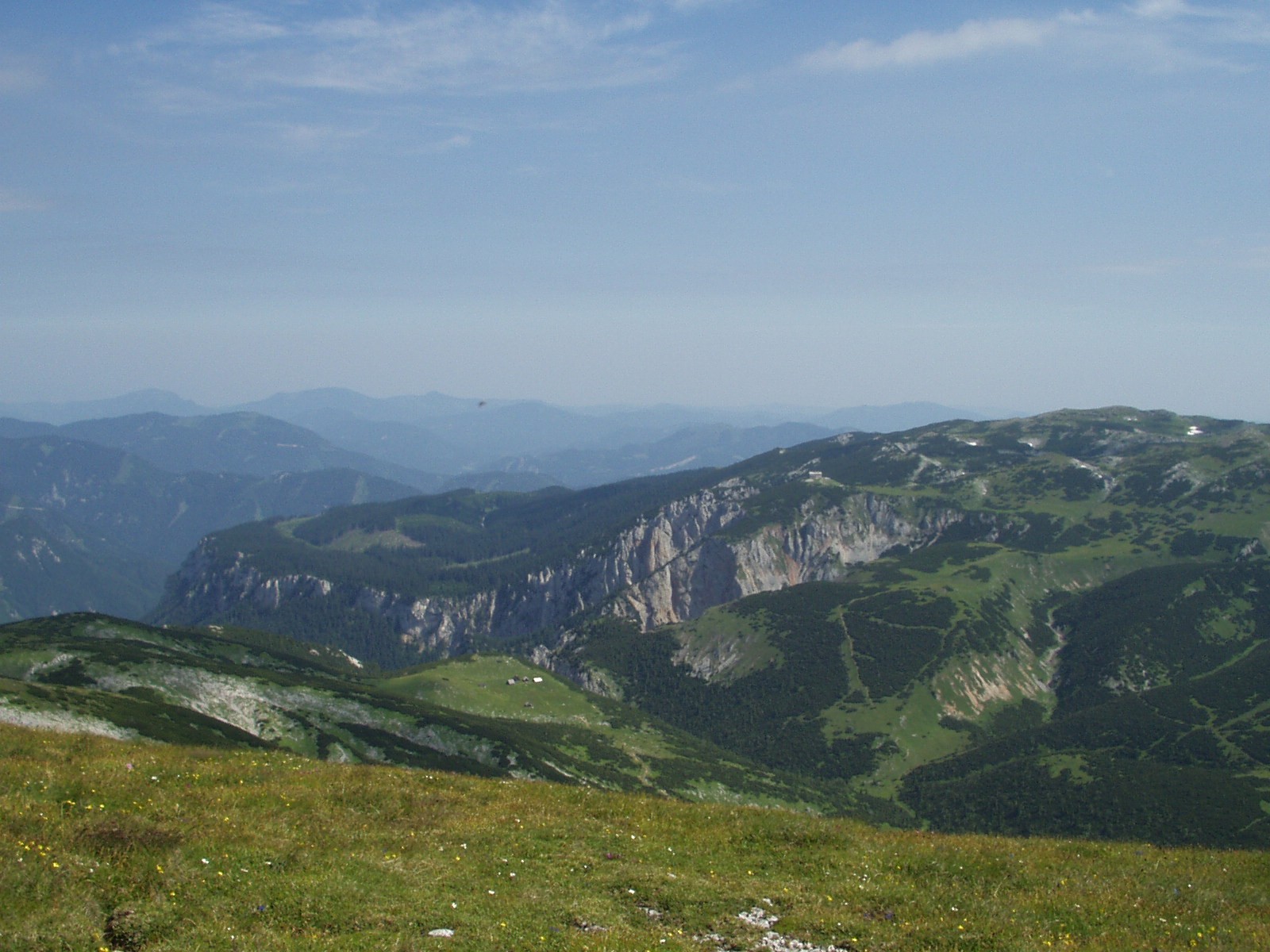Ráno vyrážím brzy, stále je krásné slunečné počasí, kolem jedenácté hodiny už stojím na vrcholu Heukuppe, nejvyšším bodě masivu Raxalpe – 2007 m. Mám v nohách deset kilometrů a 700 metrů převýšení. Jsem na prostřední ze tří samostatných horských skupin Schneeberg, Raxalpe a Schneealpe, obě sousední jsou z tohoto místa vidět jako na dlani. Dole pode mnou za protějším nízkým hřebenem se skrývá Semmering, nejvyšší místo staré rakouské dálkové železnice, která směřuje z Vídně na jih do Itálie. Tisíc metrů pod sebou vidím malé horské vesničky a na mýtinách a loukách uprostřed lesů zemědělské usedlosti a všudypřítomné pasoucí se krávy.