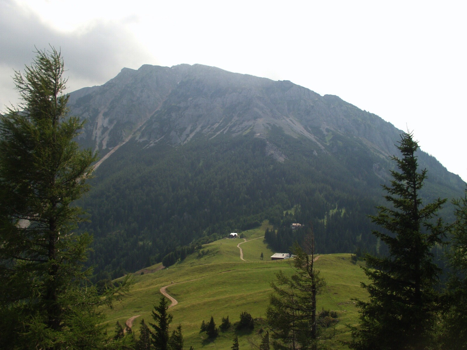 Nejrychlejší sestupová cesta vede přímo po skalní stěně, je jištěná řetězy a skobami, ale sám a bez horolezeckého vybavení si na ni netroufám, a tak volím okliku. Sestupuji do 1200 metrů a pak jdu víc než hodinu po úzkém lesním chodníku nad údolím. Zastavuju se u horského potoka a dělám si vydatný oběd, abych měl dost energie na náročné stoupání. Přitom vzpomínám, jak jsem šel po podobné trase před pár lety – tenkrát jsem přecházel mezi oběma masivy severní stranou, kde jsem musel sestoupit ještě o 400 metrů níž. Tady je to pohodlnější. Jsem rád, že tento den, kdy nejvíc z celé mé cesty pálí slunce, jsem se mohl několik hodin schovávat v lese. Ale brzy to skončí – vydávám se po úzkém klikatém chodníku vzhůru na Schneealpe.