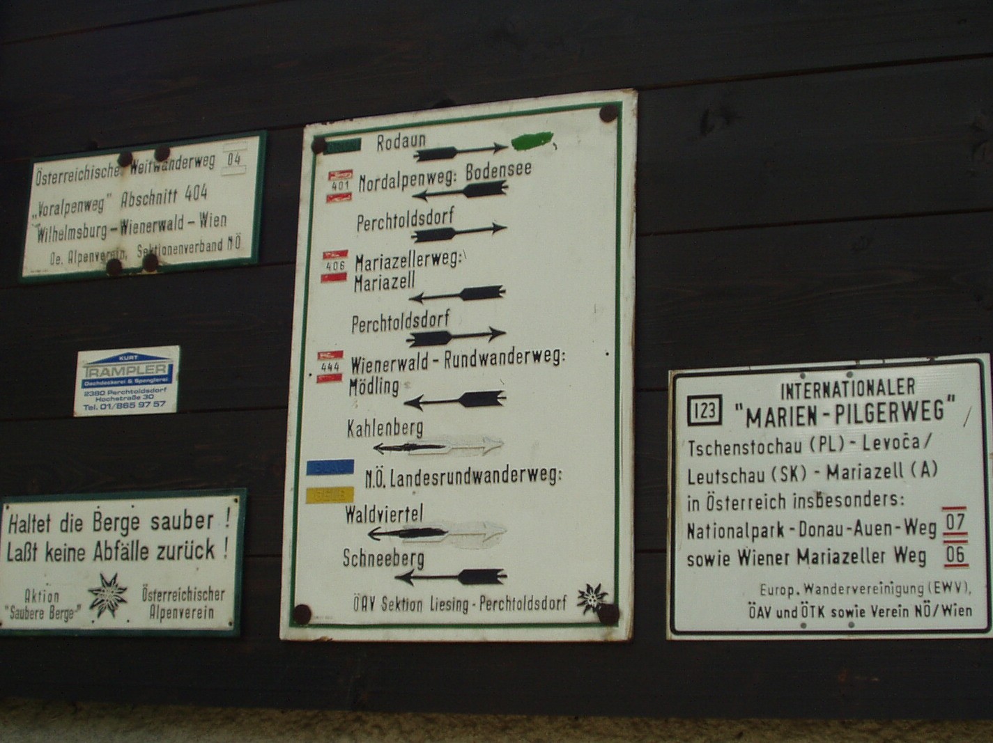 Zde tedy začíná moje putování: je čtvrtek 14. července 2005, dvě hodiny odpoledne, docela teplo a slunečno, ale žádný velký pařák – téměř ideální počasí na túru. Po krátkém kličkování posledními předměstskými uličkami se nořím do hlubokých lesů a stále stoupám klikatou turistickou cestou. Kostel v Perchtoldsdorfu je 265 metrů nad mořem – tak nízko už se nikdy za celou další cestu nedostanu. Naopak, hned první tři kilometry mě přivedly o tři sta metrů výš k první "horské chatě" – z rozhledny u Kammersteiner Hütte vidí člověk pod sebou celou Vídeň jako na dlani a důchodci sem chodí na nedělní vycházky, přesto už zde všechno dýchá nefalšovanou alpskou atmosférou: výstup nahoru po příkré stezce, dřevěná chata s vyznačenou nadmořskou výškou a s charakteristickými turistickými rozcestníky (jeden z nich ukazuje, že tudy prochází poutnická cesta Tschenstochau – Leutschau / Levoča – Mariazell), bílé skály a skalky všude kolem, vandrovníci s batůžky a nepostradatelnými trekovými holemi, a samozřejmě pivo za tři eura.